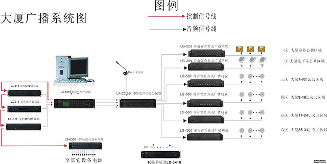 公共廣播係統為賓館、商廈、港口、機場、地鐵、學校提供背景音樂和廣播節目。近幾年來,公共廣播係統還兼做緊急廣播,可與消防報警係統聯動。公共廣播係統的控製功能較多。如選區廣播與全呼廣播功能、強製功換功能和優先廣播權功能等。揚聲器負載多而分散、傳輸線路長。為減少傳輸線路損耗,一般都采用70V或100V定電壓高阻抗輸送。聲壓要求不高,音質以中音和中高音為主。