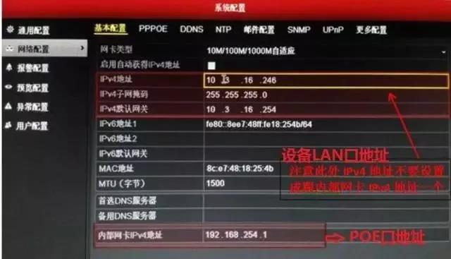 注意:不能將PoE錄像機LAN口IP地址設置成和內部網卡IP地址在一個網段,否則通道將無法添加。