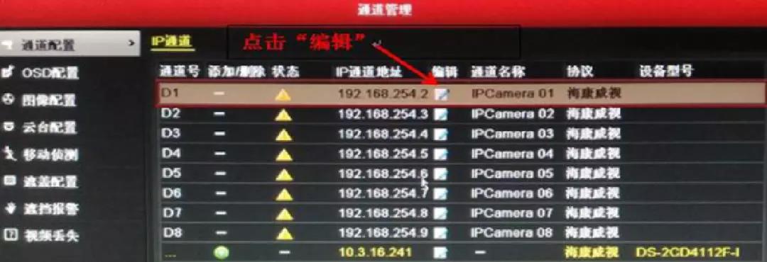 ② 進入通道管理—通道配置,找到IP通道狀態為“—”的通道,點擊“編輯”進入修改界麵,將搜到的攝像機IP改成和錄像機LAN口IP一個網段的IP地址