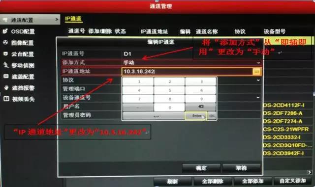 ④ 將“添加方式”改為“手動”,將“IP通道地址”改為②中你修改成功的攝像機IP地址,密碼為攝像機激活密碼,點擊“確定”。
