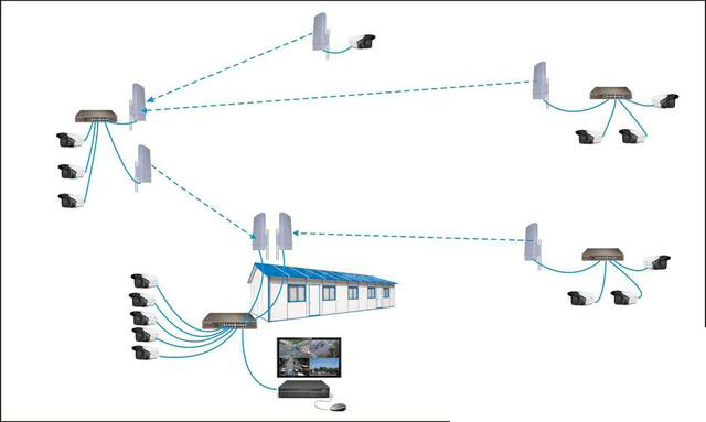 魚塘一般麵積大、地形複雜、施工布線難而且攝像頭點位多,因此一般采用無線網橋傳輸,無線網橋自動選頻,能避免網橋之間的頻率幹擾,信號傳輸距離遠,施工難度小,視頻信號傳輸穩定,可將無線網橋與智能警戒攝像頭安裝在同一監控杆上。部分條件受限製的地方可采用太陽能板給無線網橋和攝像同時供電,減少布線的難度,多對網橋之間需間隔1m以上,網橋需配對且正麵對齊使用。