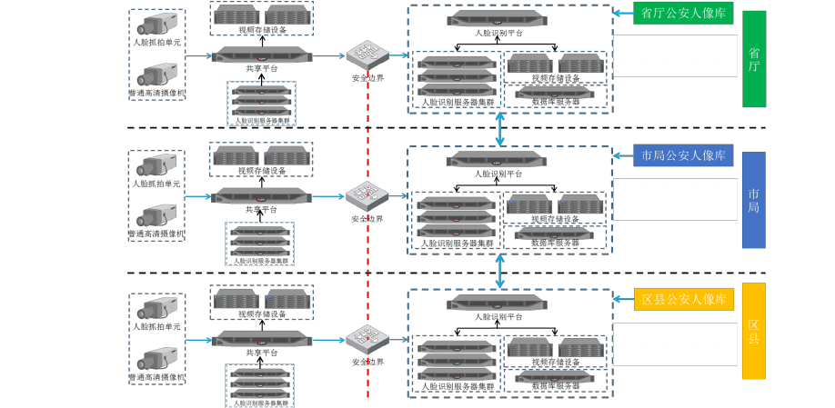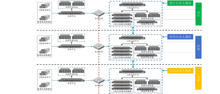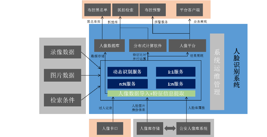 在公安網中部署人臉識別係統,前端人臉卡口通過共享平台傳輸視頻至公安網.公安網下人臉識別平台對接共享平台獲取前端數據,導入識別服務器進行特征提取和識別比對,並通過人像大數據平台進行業務分析,數據挖掘等工作。