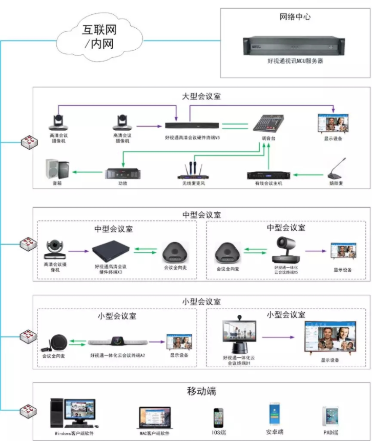 功能簡介:多媒體會議室是個可以滿足召開各種報告會、演講會、討論會議、學術交流會等需要的平台。可實現視頻高清晰顯示和音頻的播放;接入遠程多媒體會議係統終端後可以召開遠程電視電話會議;滿足舉辦舞台文藝演出的需要,舞台燈光效果滿足演出的專業要求;實現攝像自動跟蹤會議發言人進行發言人的實時特寫,實現會議直播功能;擴聲場地有較高的語言清晰度、無明顯回音、顫動回聲和聲聚焦等音質缺陷;聲音與頻響覆蓋均勻;實現整個會場內大屏、信號切換、電源控製等係統的統一管理與控製。湖北午夜影院污污视频智能專業弱電工程午夜福利免费影院:會議係統、多媒體會議室、多功能會議,視頻會議工程安裝維修改造工程
