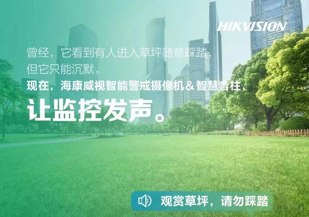 在小區觀賞草坪的散步道附近安裝海康威視智能警戒攝像機,進行提示喊話“綠色草坪,請勿踩踏”,讓違規的人意識要問題的嚴重性。