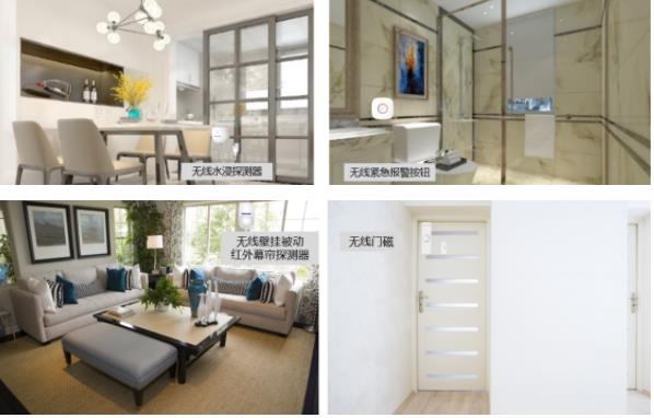 在廚房/部署無線水浸探測器,探測廚房漫水;廁所/老人臥室部署無線報警按鈕,出現意外情況,及時通過按鈕示警;大門部署無線門磁,能夠識別大門開關動作;門窗部署無線壁掛被動紅外幕簾探測器,能夠探測人體穿越門窗;書房/臥室等存放貴重物品處,可部署無線位移探測器,探測室內物品的移動;全屋部署無線探測設備,出現意外情況時,通過報警主機發出報警信號至報警中心,業主可及時接收報警消息,采取相應措施。